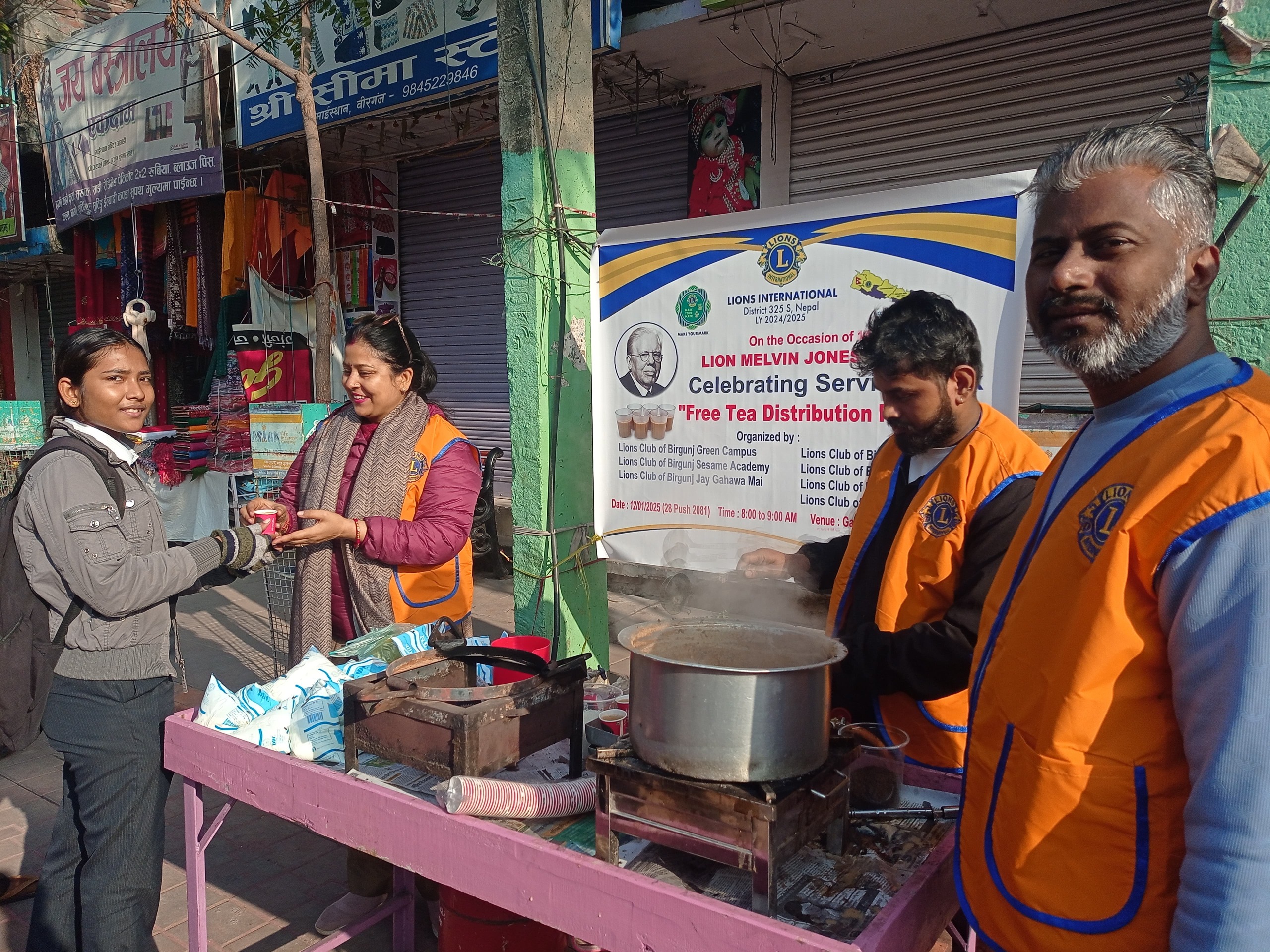 साता ब्यापी कार्यक्रम अन्तर्गत लायन्स क्लब अफ वीरगञ्ज ग्रीन क्याम्पस, सेस्मी एकेडेमी, विजय पथ, गोल्डन स्पैरो, गहवामाई, ग्रीन सिटी र इनिसिएटिभको संयुक्त आयोजनामा चिया वितरण गरिएका हो । अहिले जाडोको मौसममा लायन्स क्लबका सदस्यहरूले समुदायलाई सहयोग गर्ने उद्देश्य सहित उक्त कार्यक्रमको आयोजना गरेका थिए ।